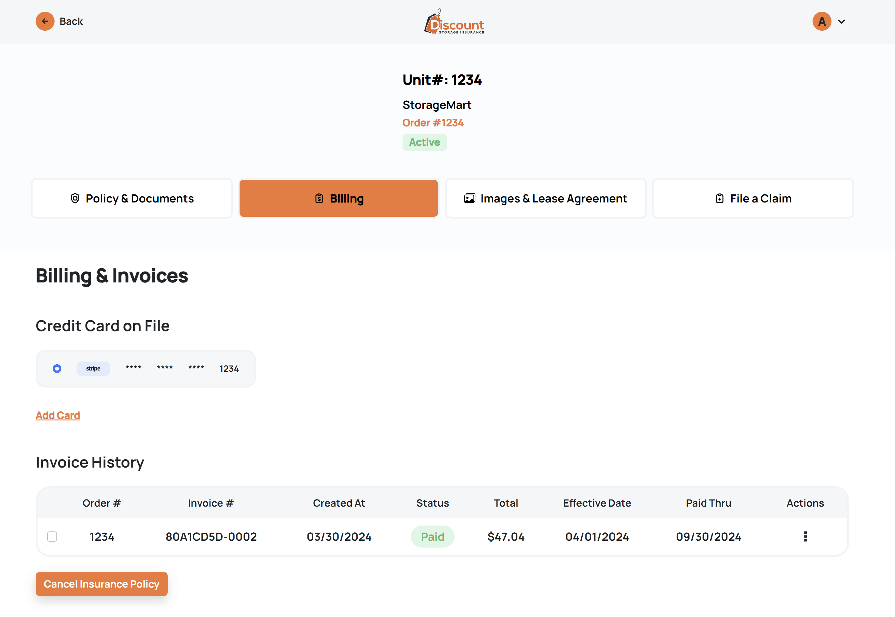 3) Beneath your invoice history, you will find a button labeled "Cancel Insurance Policy" for your convenience.