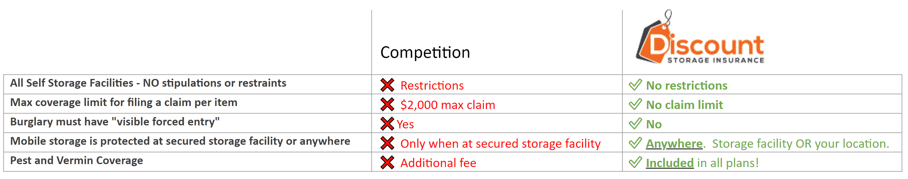Want to know the Discount Difference? Aside from our outstanding customer service and coverage policy, below table below highlights several typical differentiating factors and benefits of Discount Storage Insurance vs the 'other guys'!